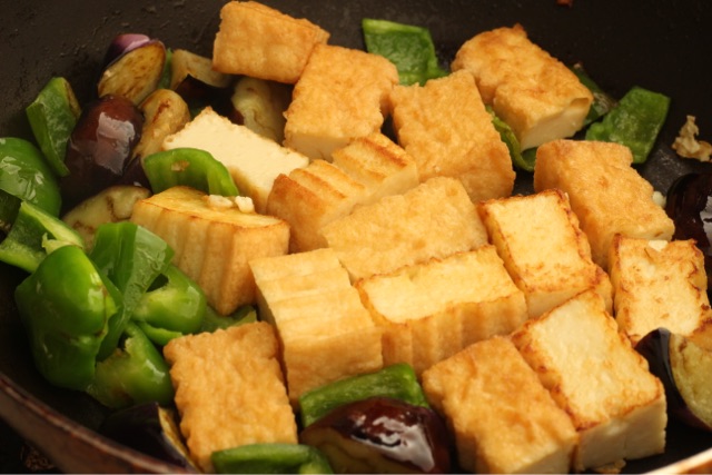 ②①の野菜を端によせ、真ん中に厚揚げを入れ、触らずじっくり焼き、焼き色がついたらまだついてない面を返す。