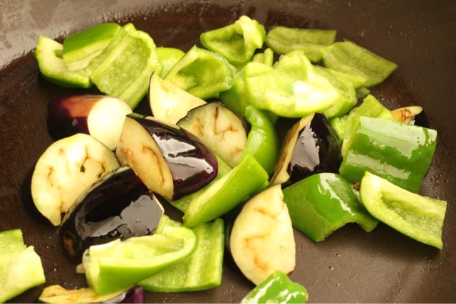 ①フライパンにサラダ油を入れ火にかけ、熱くなってきたらなすとピーマンを入れ、全体に油がいきわたるよう炒める。