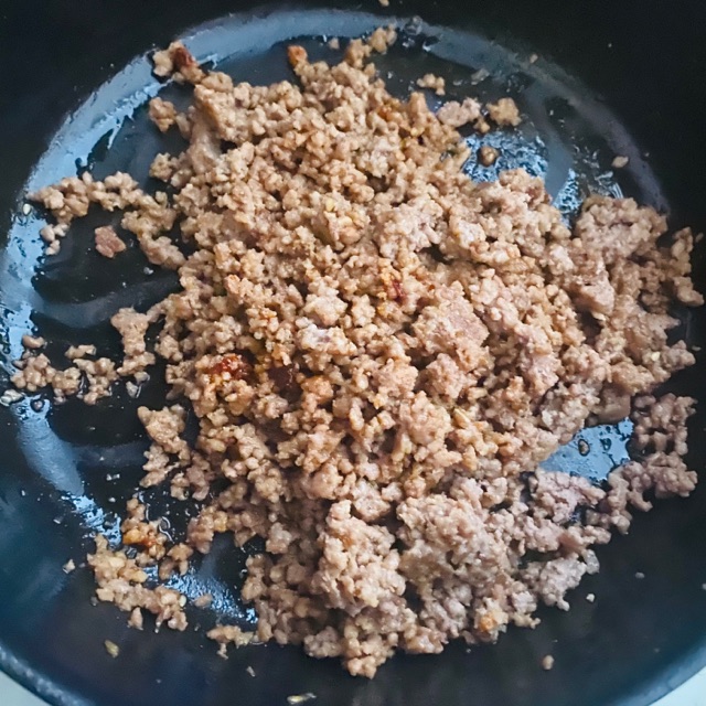 ②フライパンにごま油を入れ、中火で熱し、牛豚合いびき肉を焼く。(時々キッチンペーパーで余分な脂を拭きとる。)
