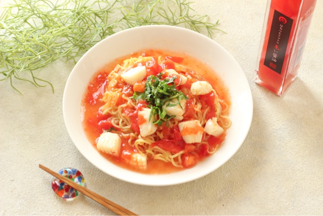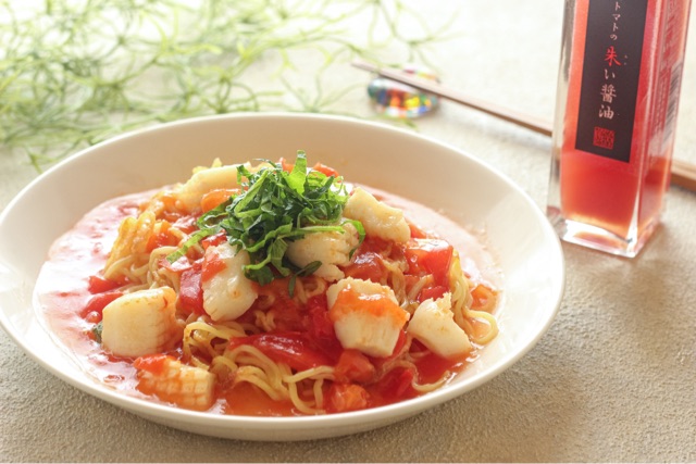 この美味しいだし醤油を使用してトマトを活かした「トマトといかのあんかけ焼きそば」を作りました。