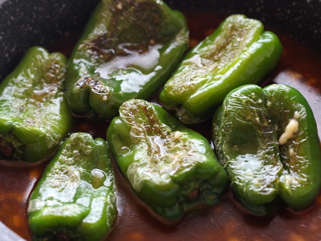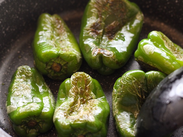 ❶フライパンに米油を入れ、中火で熱し、ピーマンを並べ入れ、焼き色を全体につける。