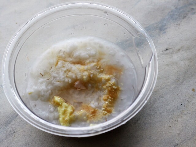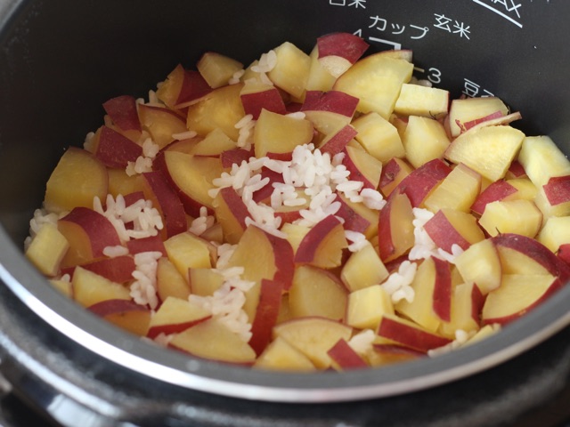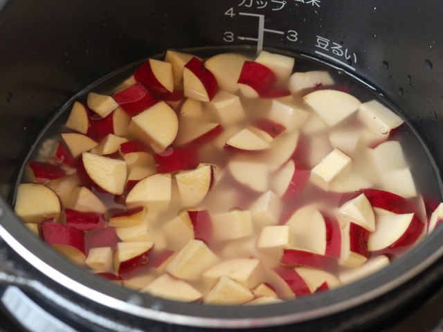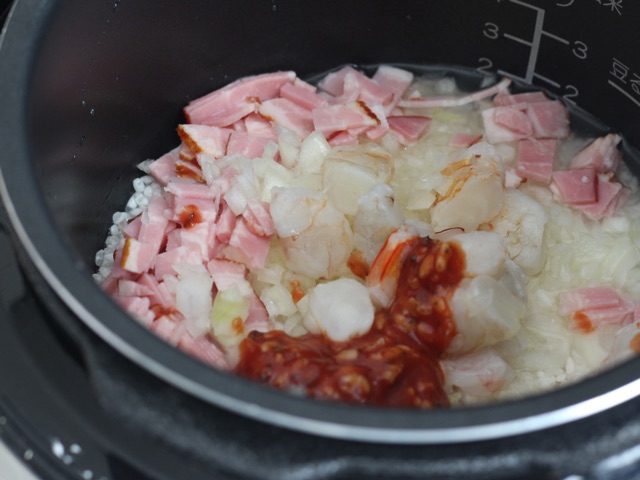 ②米を研ぎ、釜に米と水を2合線より気持ち少なめに水を入れ、塩麴・酒をとうもろこしの粒を入れる。