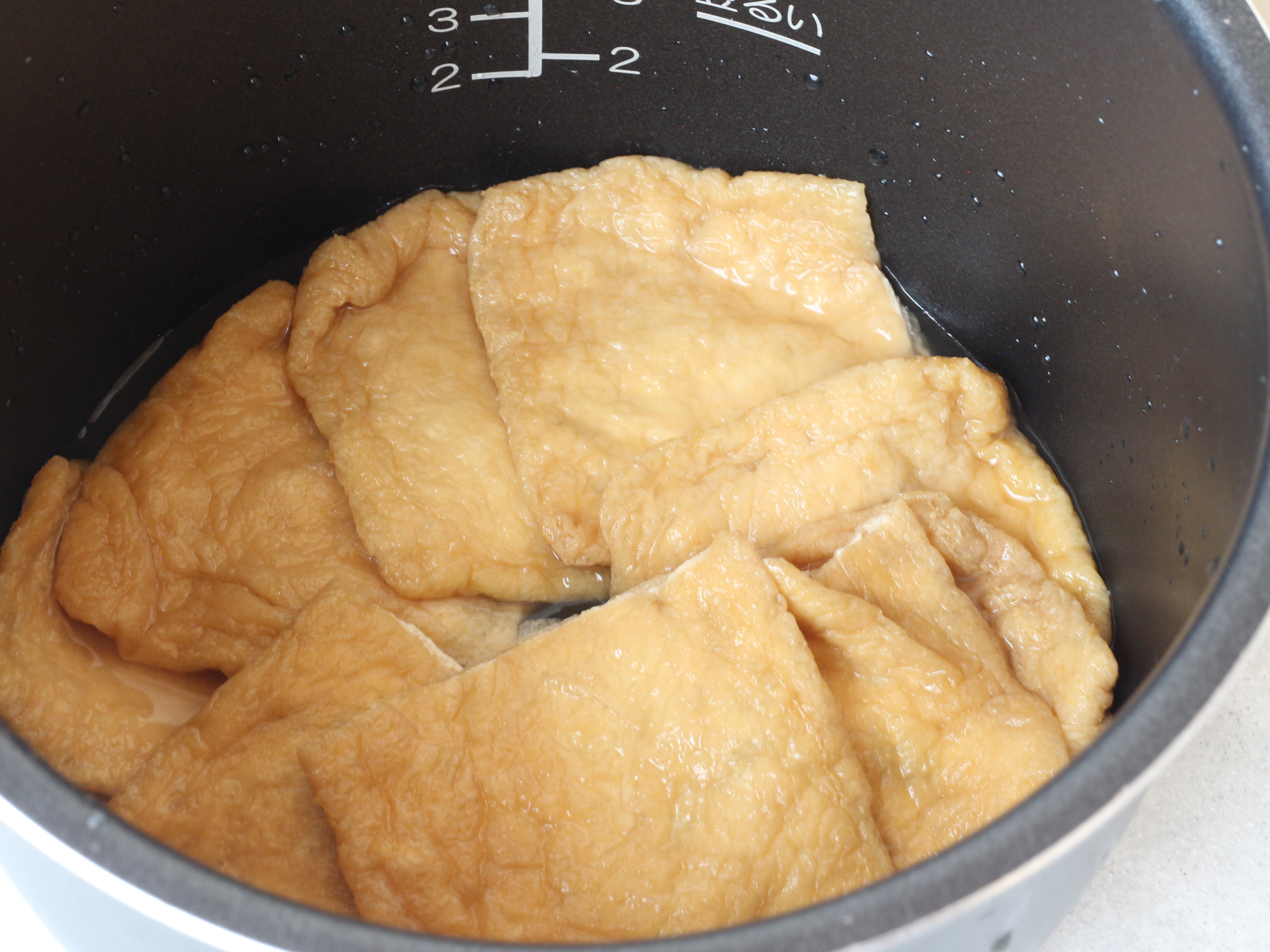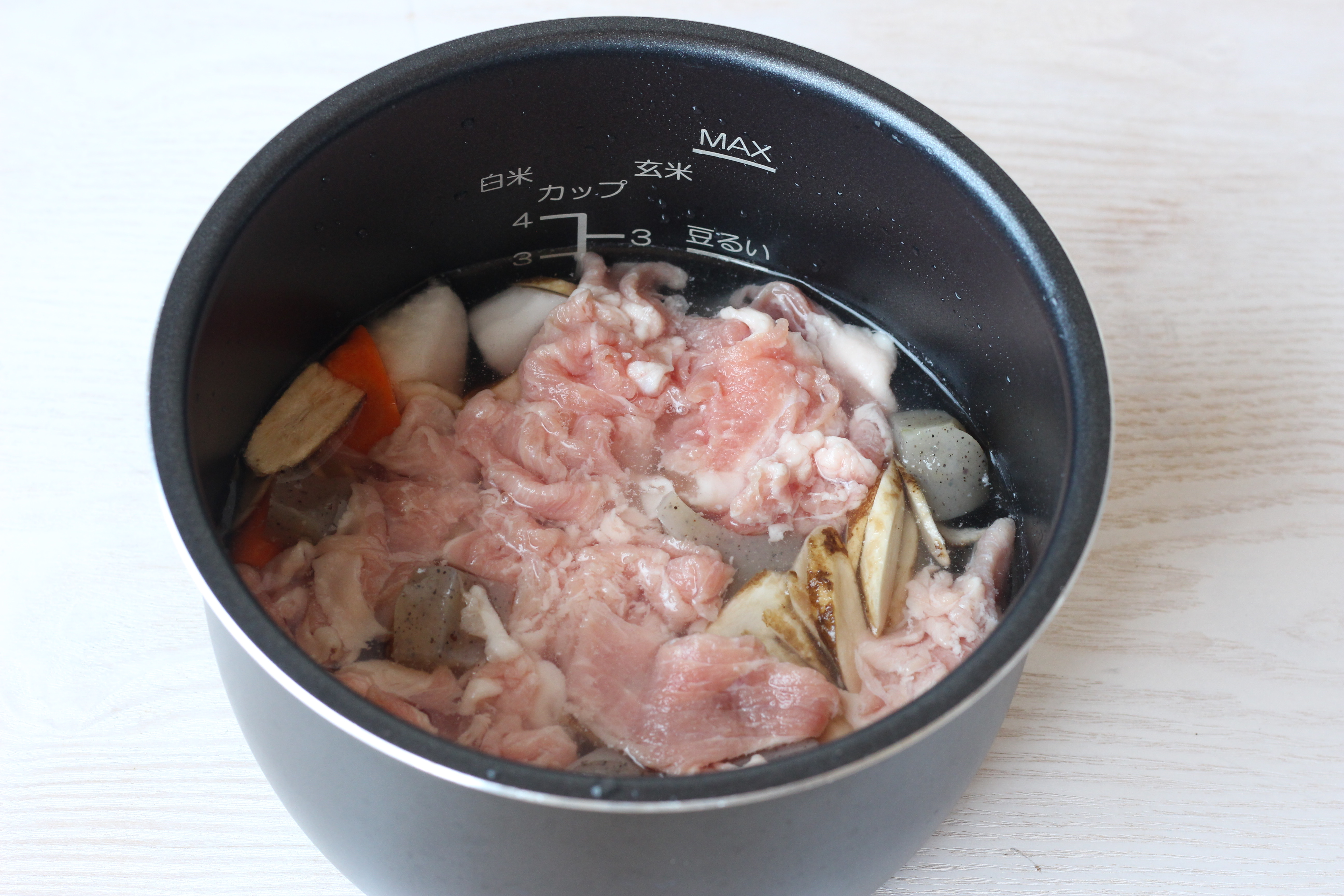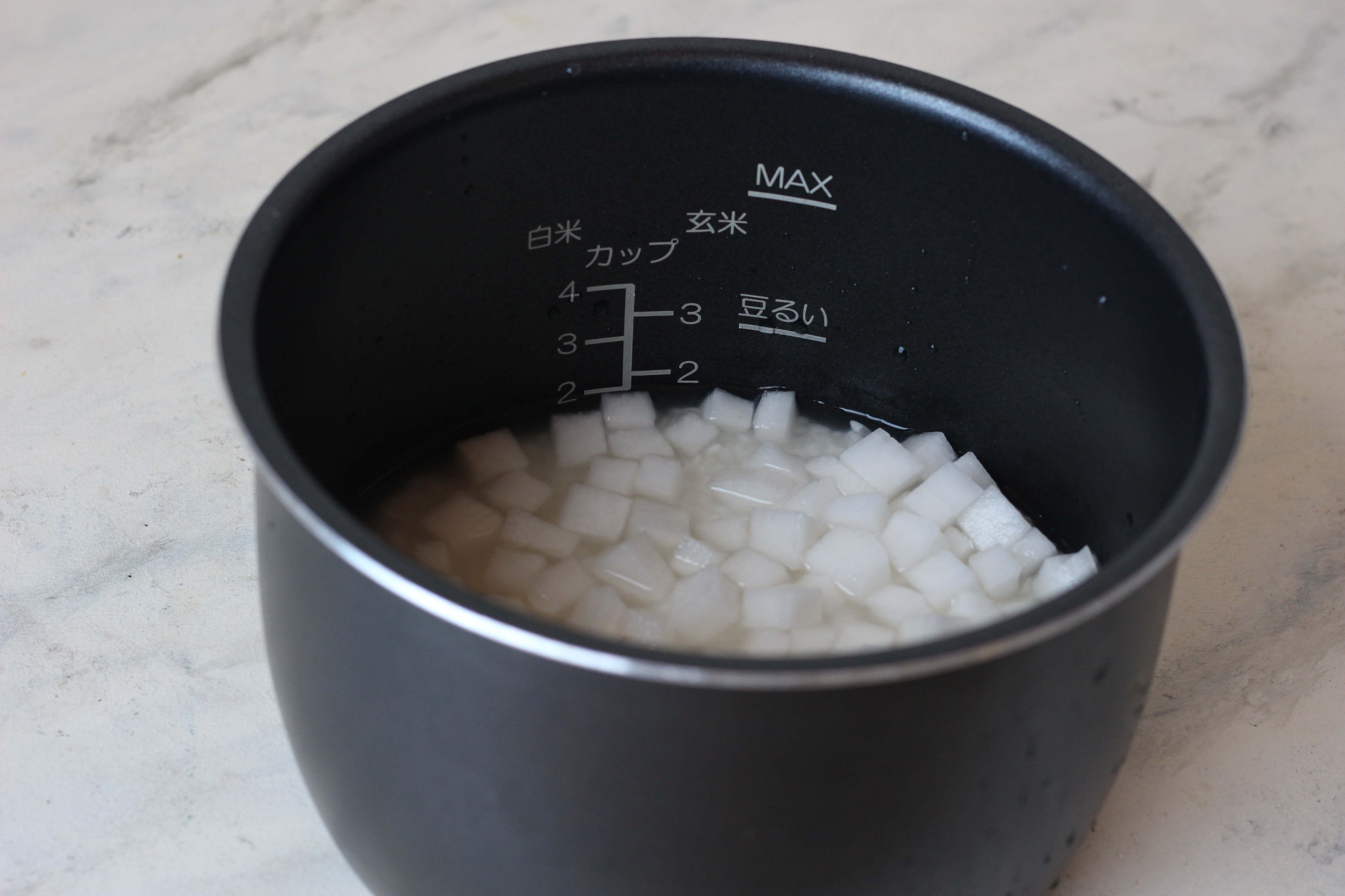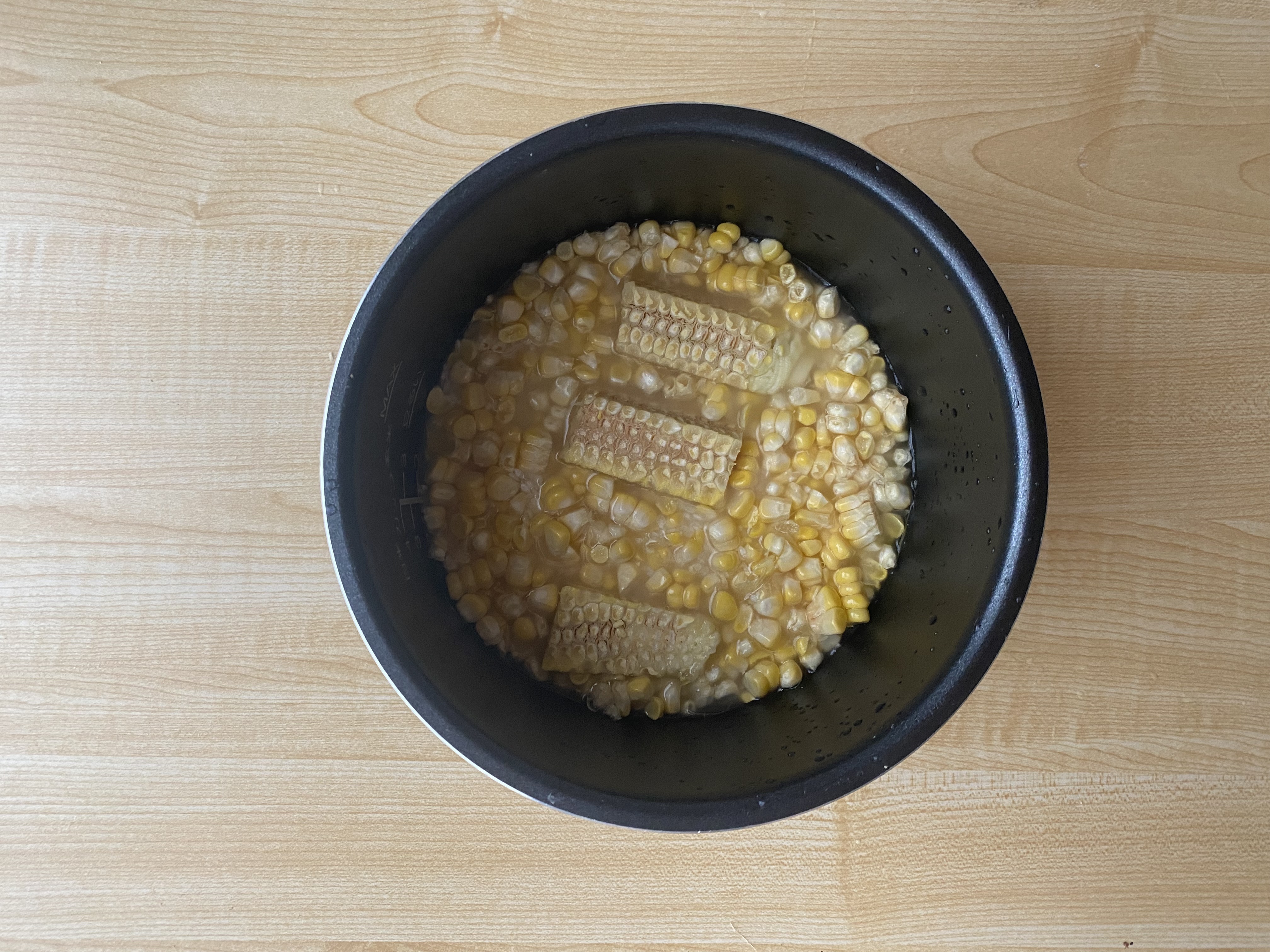 ②米を研ぎ、釜に米と水を2合線より気持ち少なめに水を入れ、塩麴・酒をとうもろこしの粒を入れる。