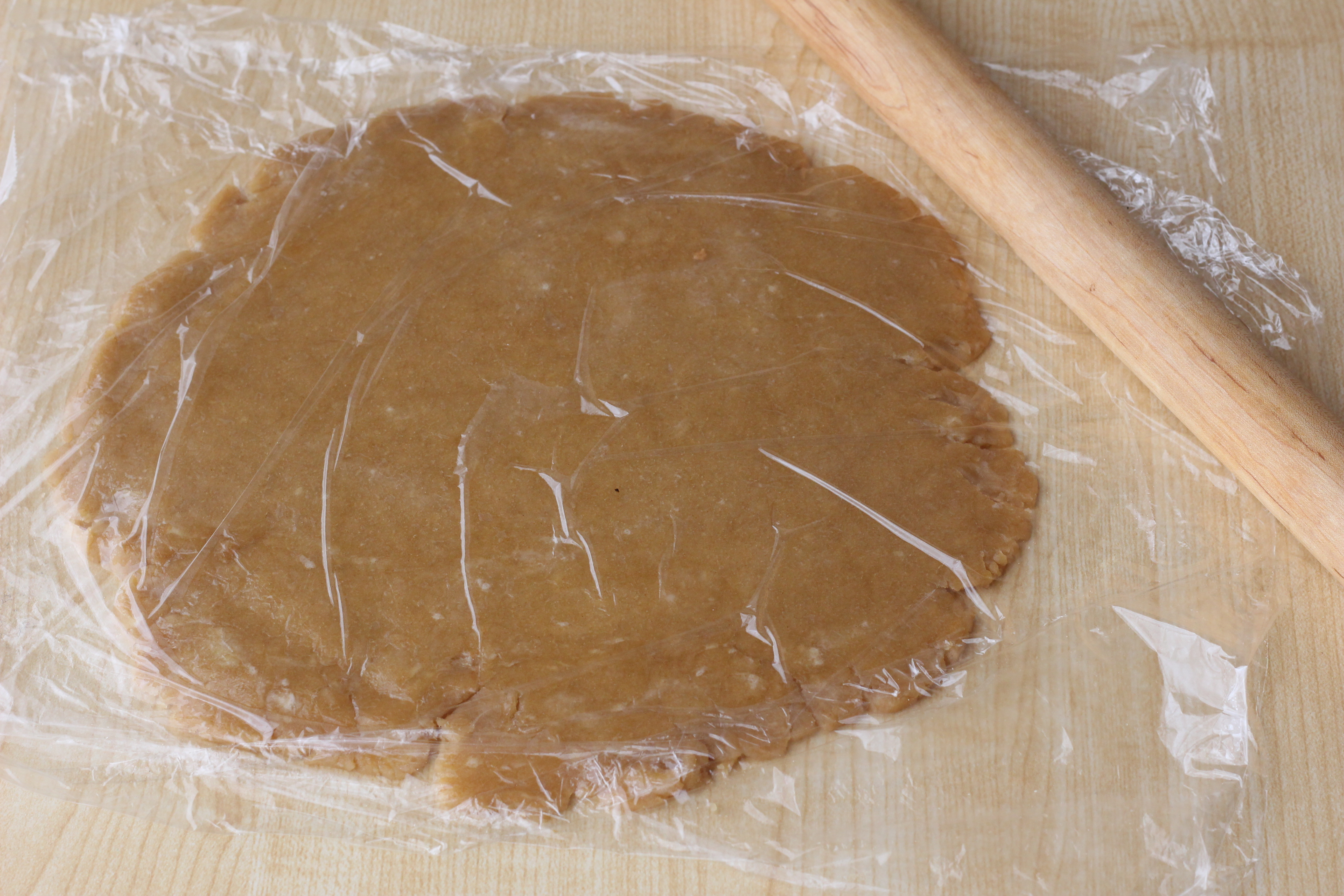 ❹ 打ち粉をふり、生地の上にもラップをのせる。型の直径より3センチほど大きめの円形に麺棒で伸ばす。
