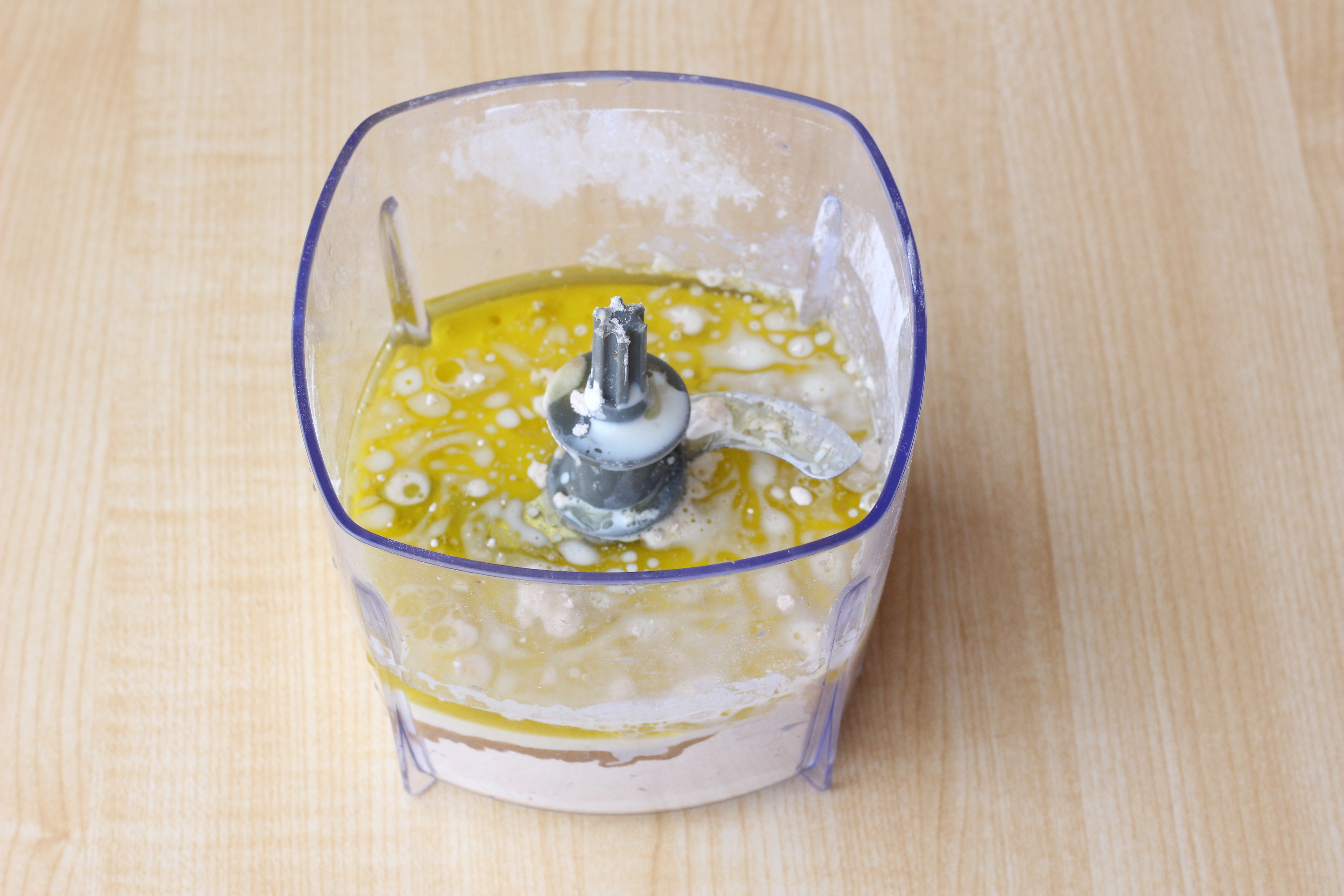 ❶フードプロセッサーに【A】を入れ、1回攪拌する。オリーブオイルを入れ、撹拌する。