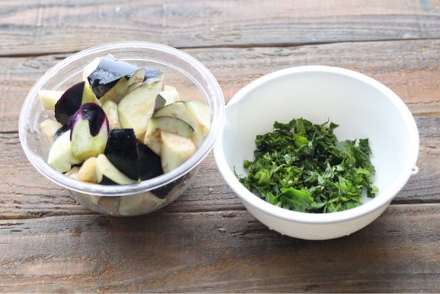 ❶きゅうり・紫玉ねぎ・トマトをそれぞれに1cm角に切る。