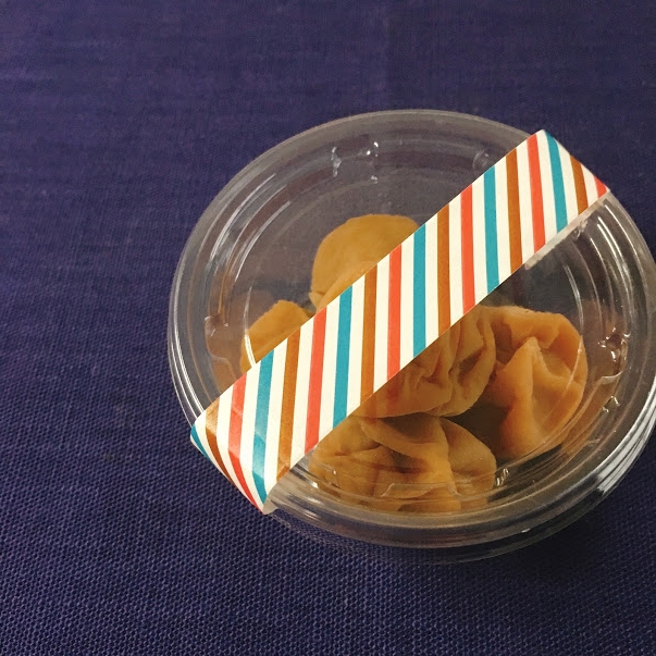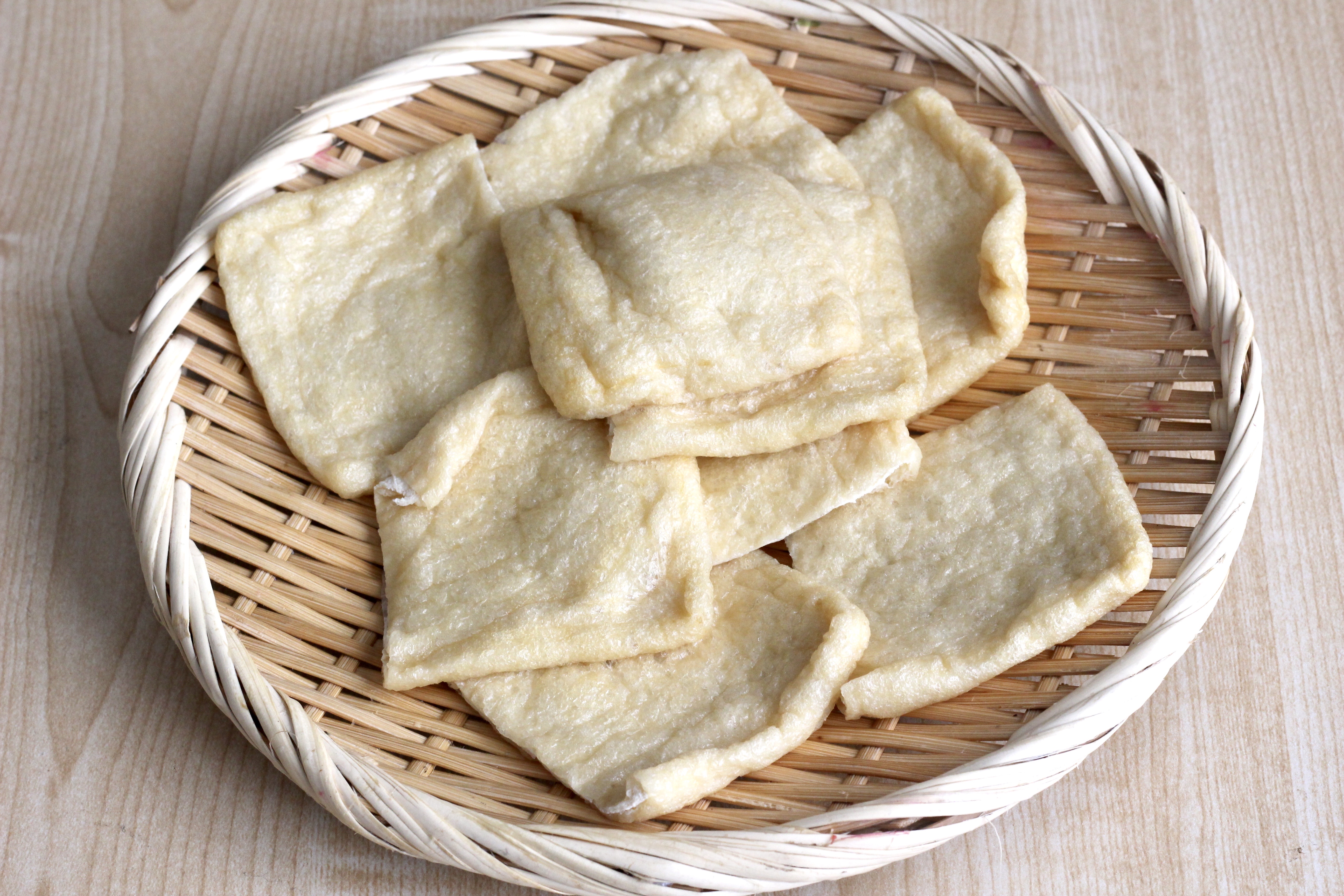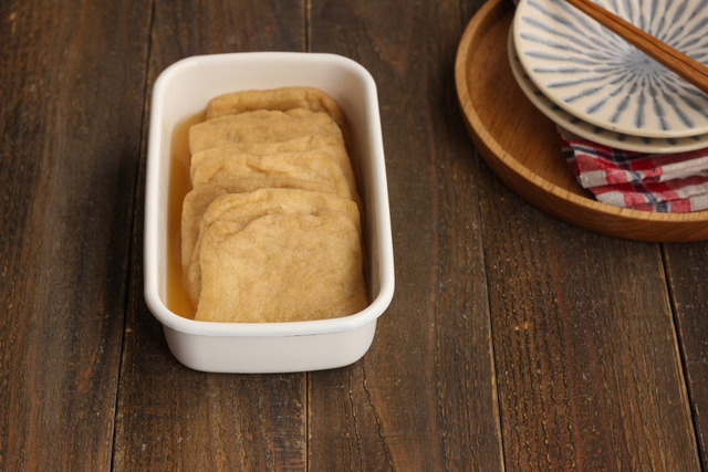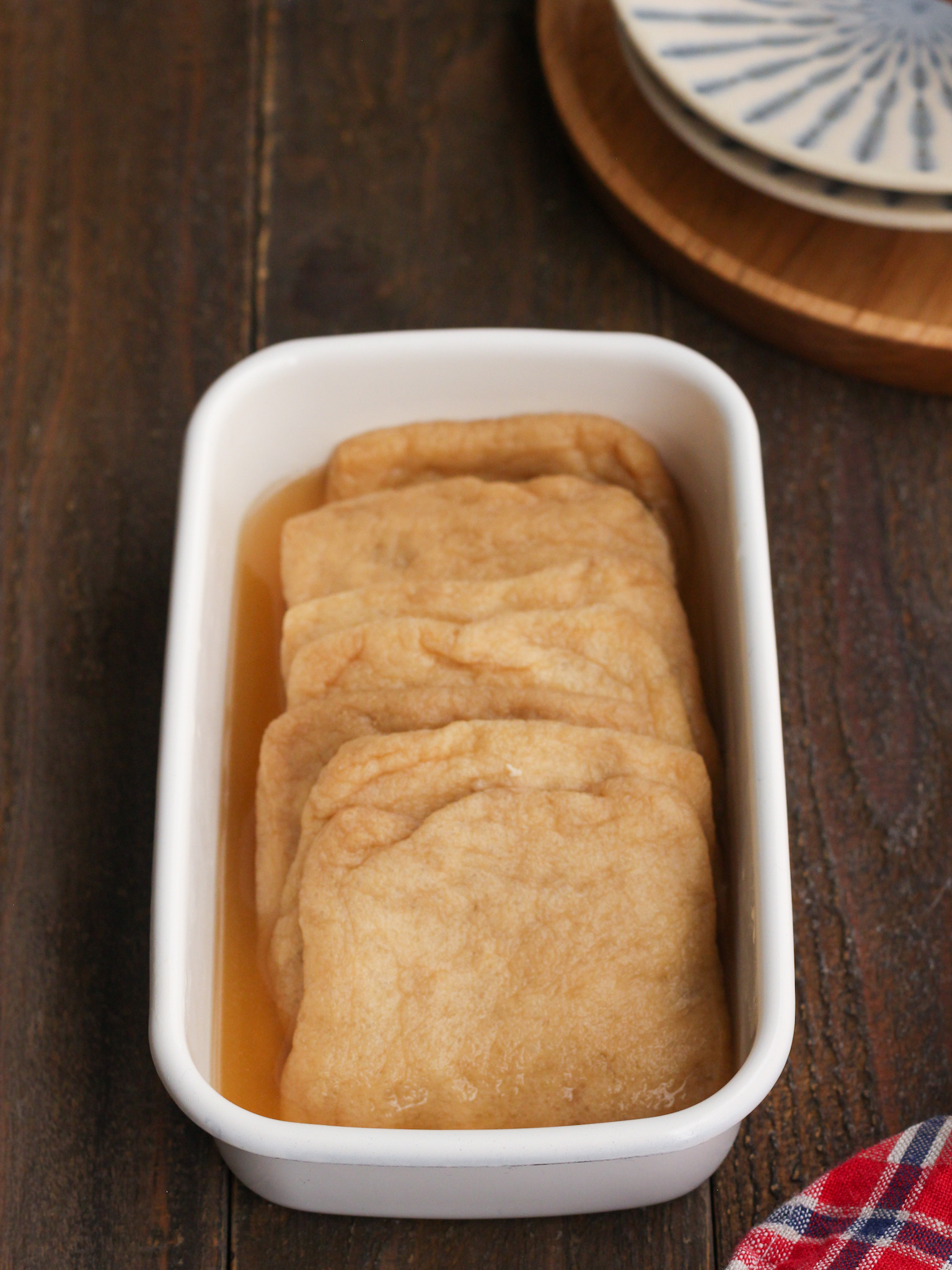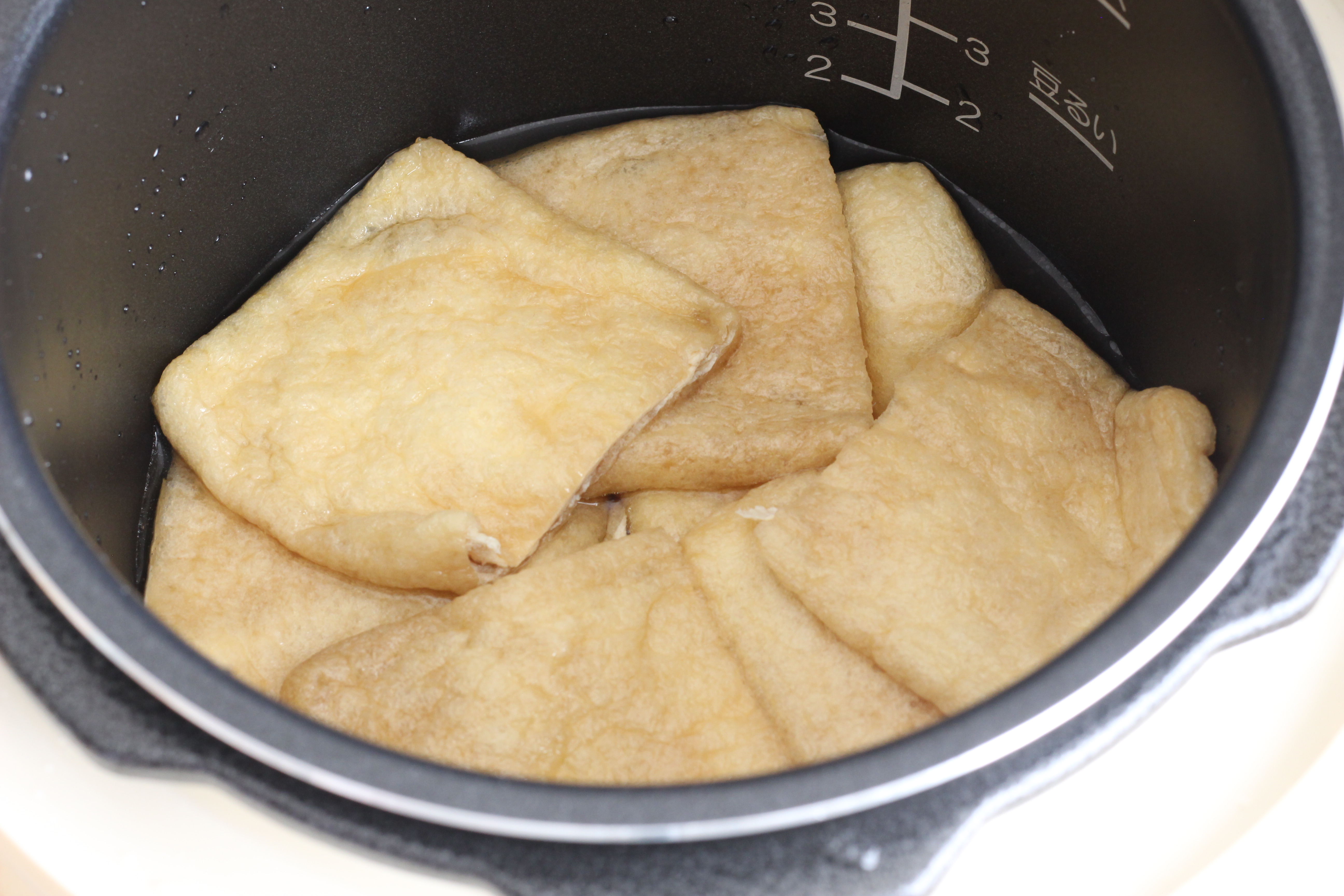 ❶ 寿司揚げは、熱湯でさっと湯がき油抜きをし、電気圧力鍋に並べ入れる。