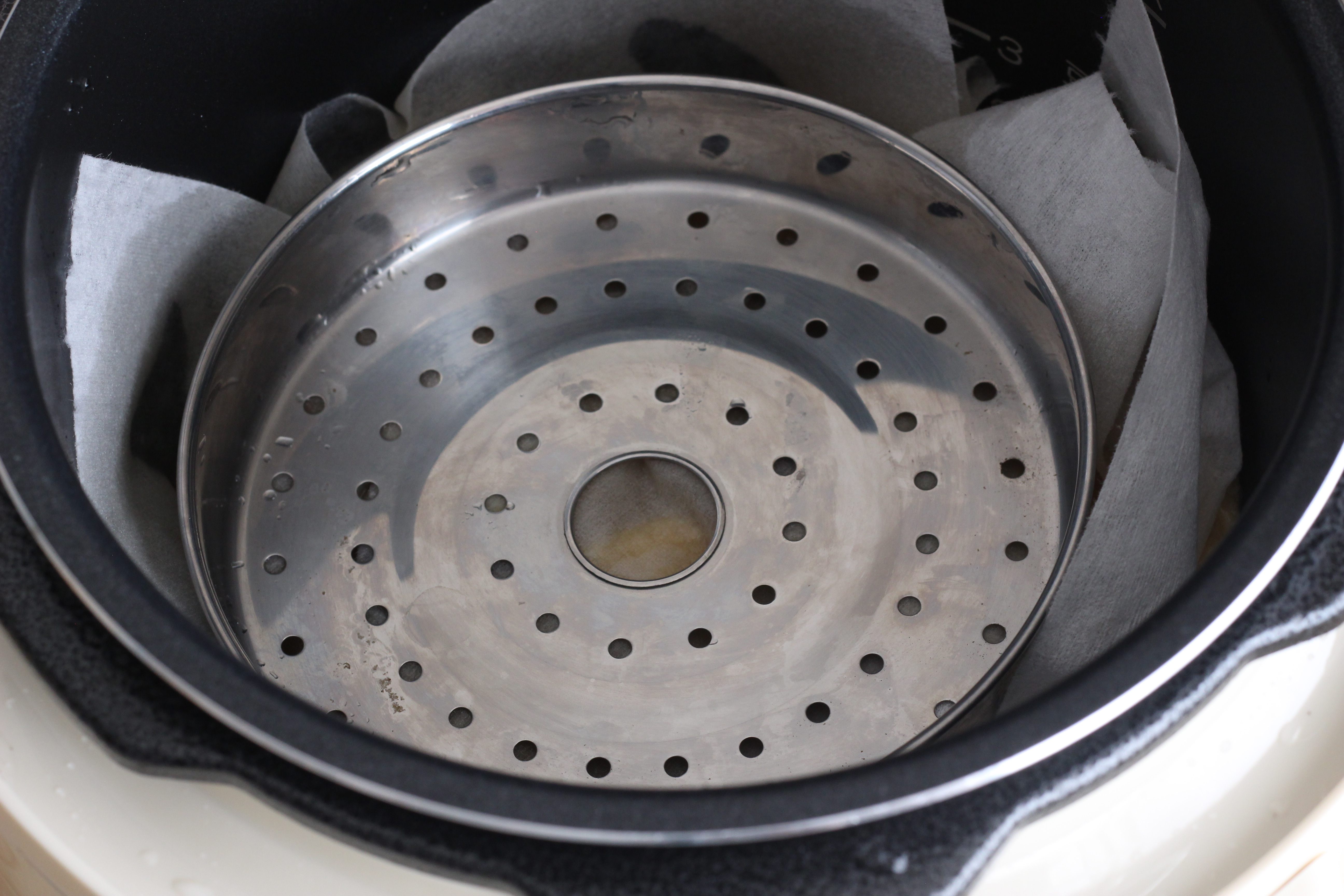 ❸キッチンペーパーをかけ、蒸し台をいれる。