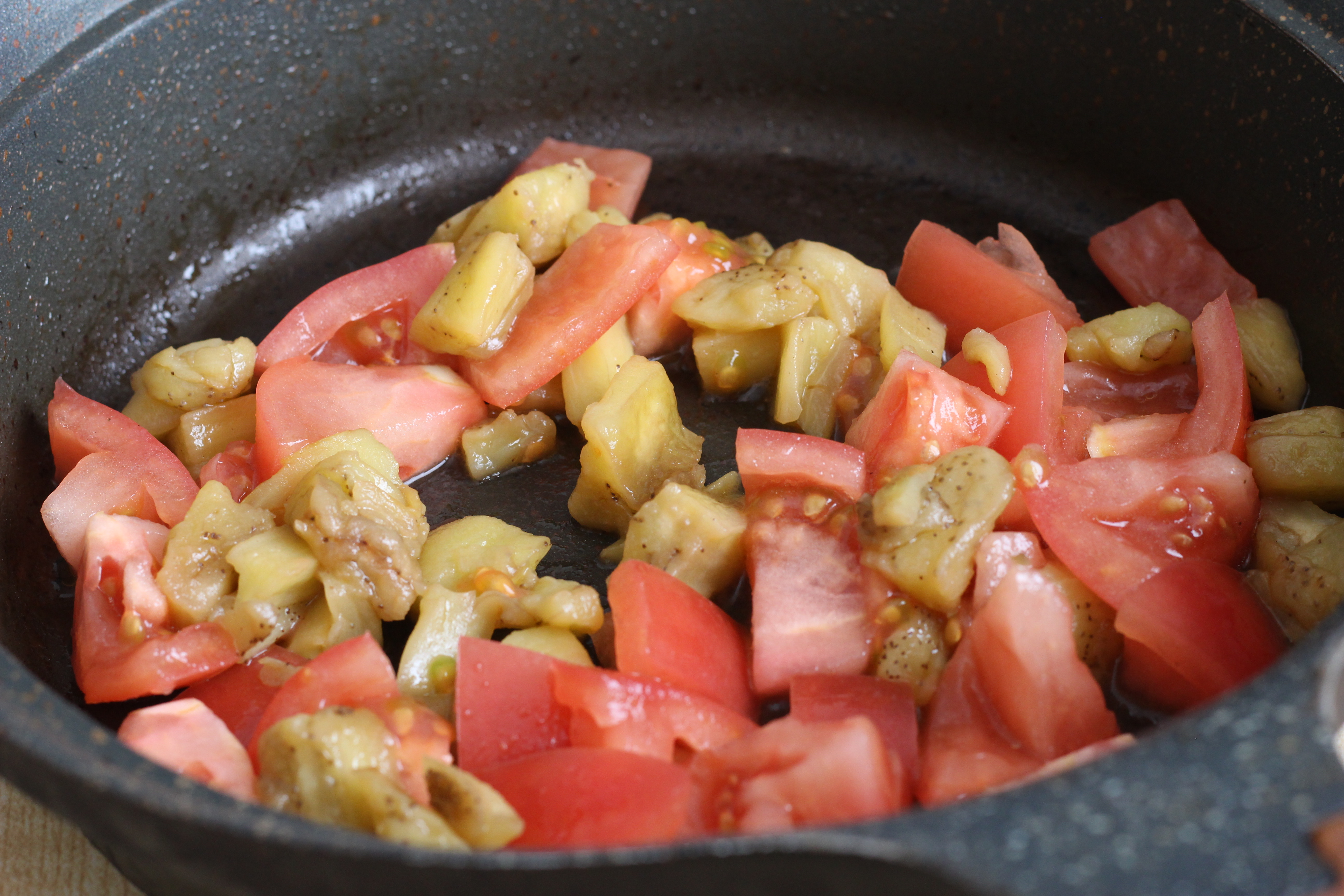 ❷フライパンに油を入れ、中火で熱し、なすの