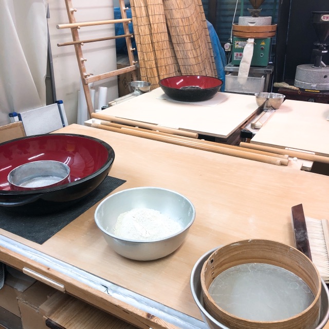 松本名人がお蕎麦屋さんの仕事場をお借りして行う本格的なそば打ち体験教室。