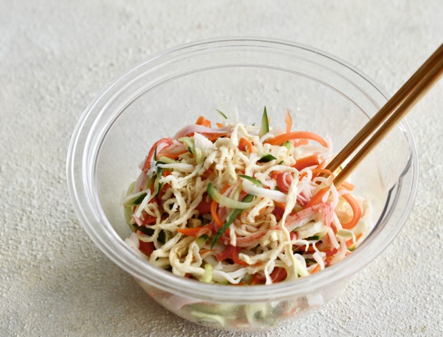 切り干し大根、カニカマをあわせ混ぜ和える。