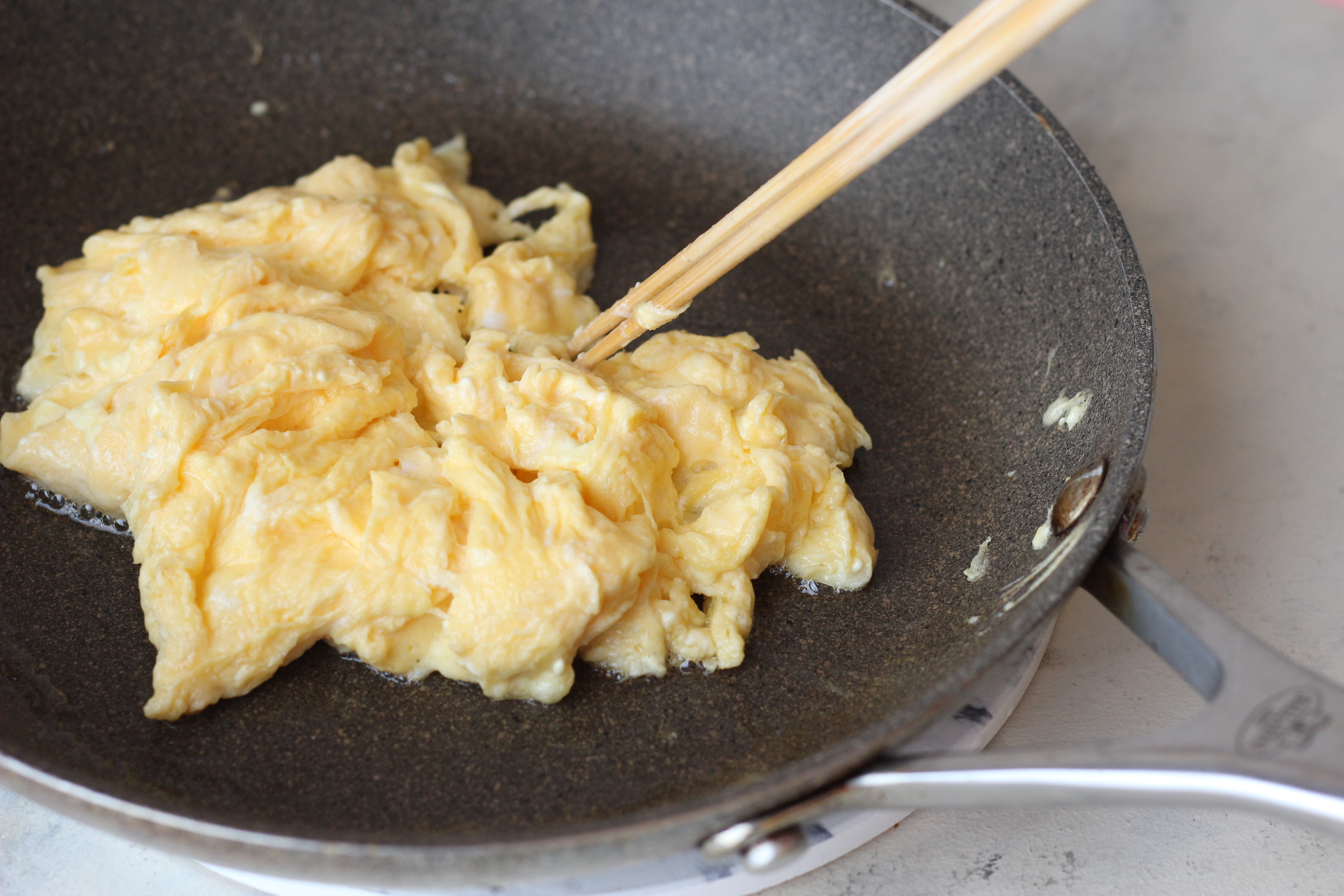 ❻①の卵を加え、崩すようにサッと混ぜあわせ