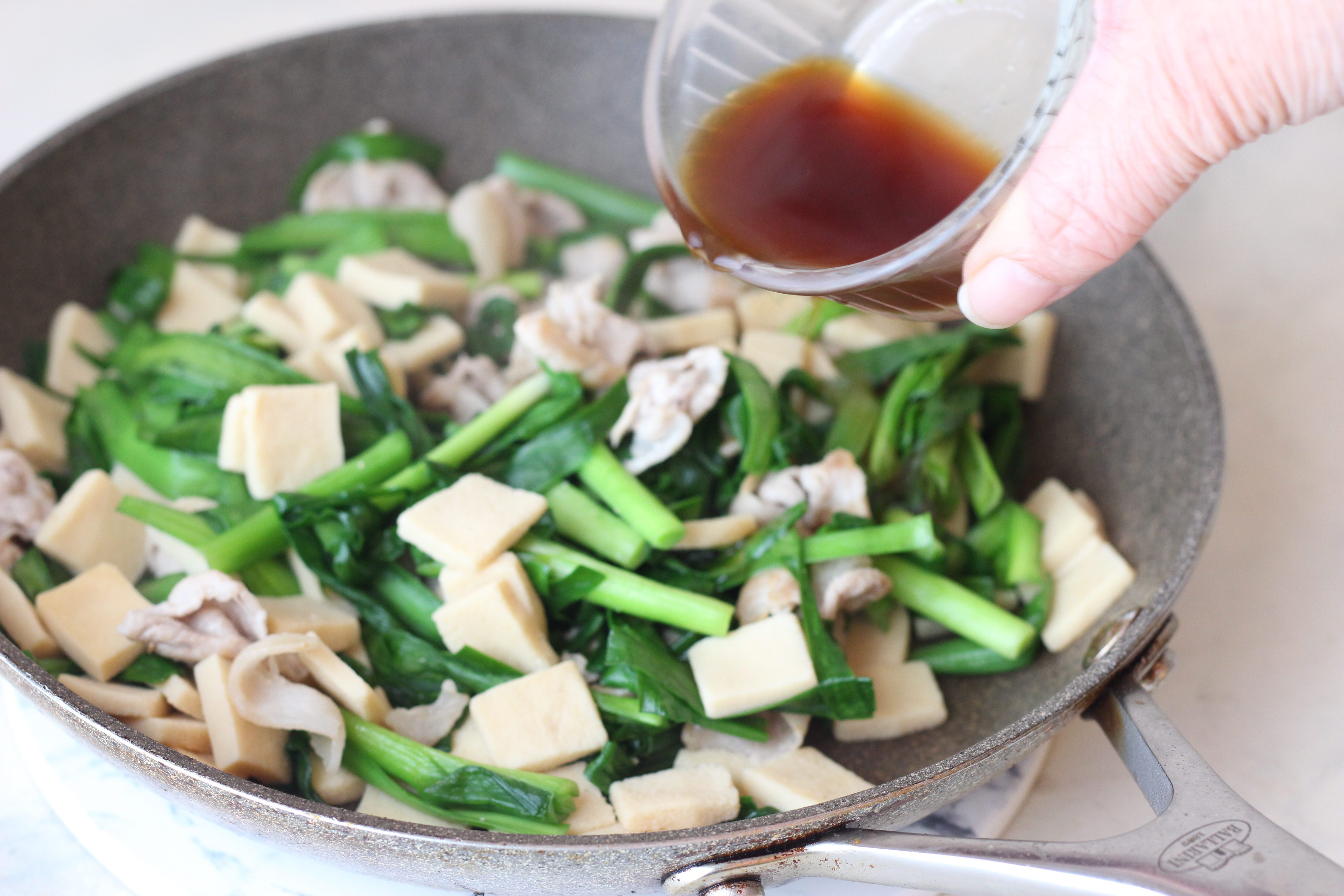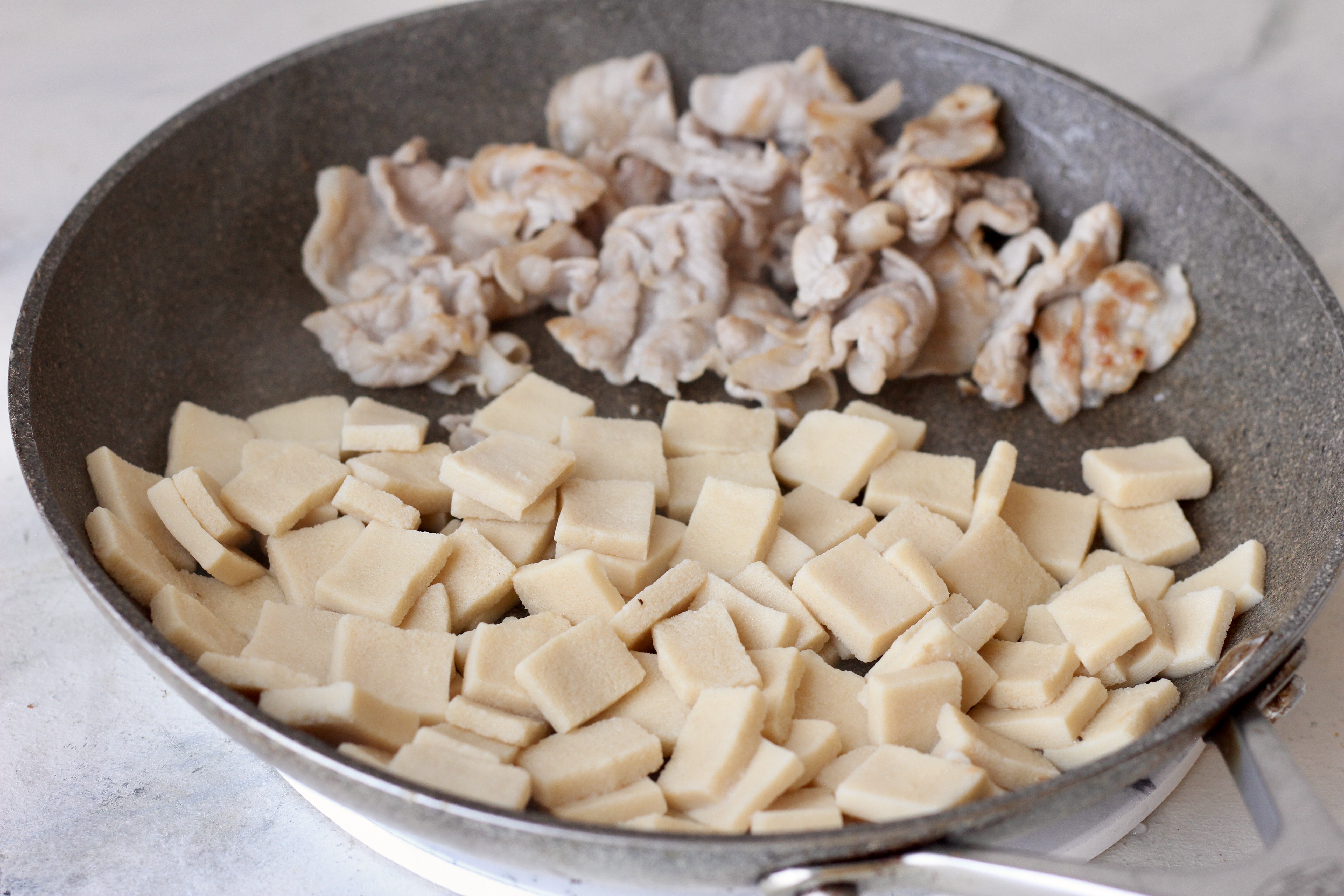 高野豆腐と水を入れ、フライパンを斜めに