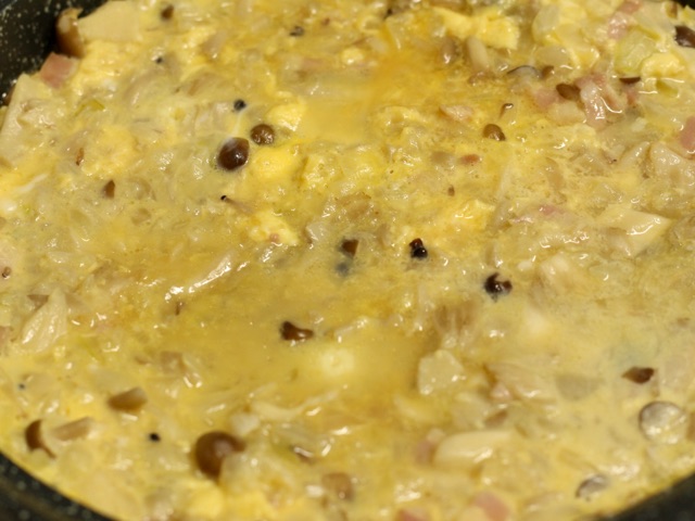 混ぜる。卵が半熟状になったら火から下ろし