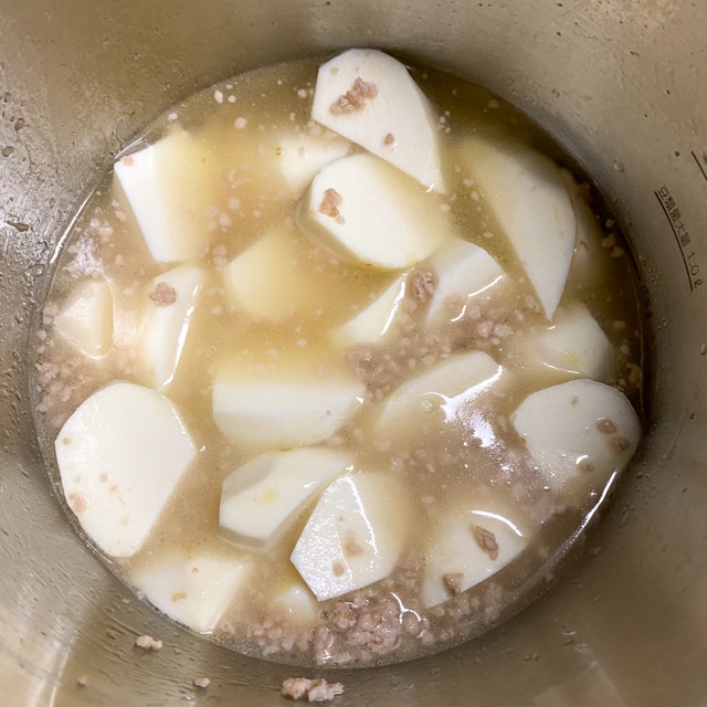 ❶大根、豚バラ肉、a)を全ていれふたをする。