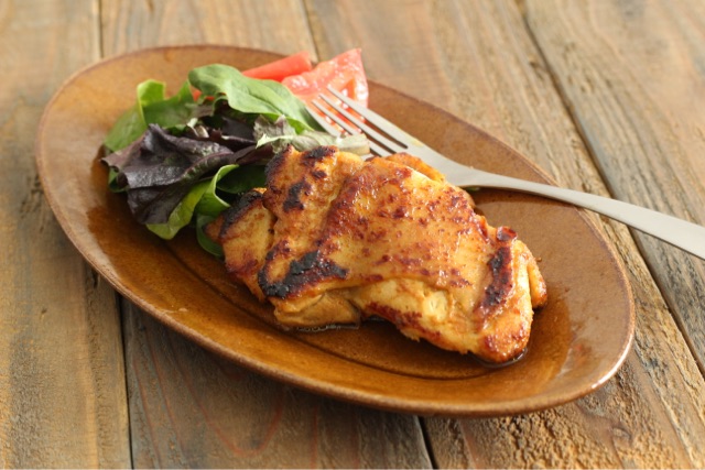 ②フライパンにサラダ油を入れ、弱めの中火で熱し、鶏肉の皮目を2~3分ほど焼き、こんがりと焼き色がついたら裏返し、ふたをする。