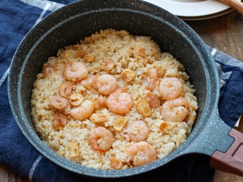 ❸フライパンにエビを入れ、赤くなったら強火にし、ごはんを加え手早く炒め合わせ、鶏ガラスープの素、塩こしょうで味を整える。